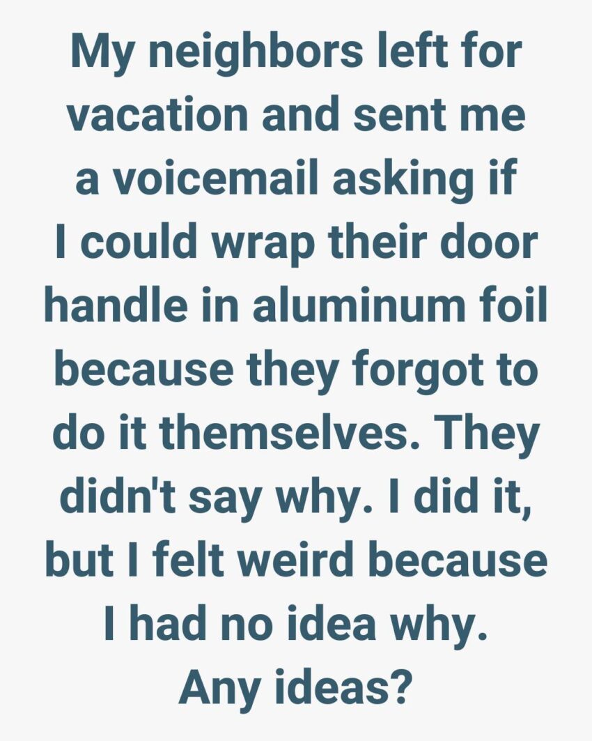 When my neighbors went on vacation, they left me a voicemail asking if I could cover their door handle with aluminum foil. They didn’t explain why, and they sounded hurried, so I agreed without thinking much about it.