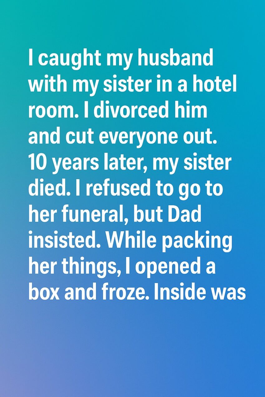 I caught my husband with my sister in a hotel room. I divorced him and cut everyone out. 10 years later, my sister died. I refused to go to her funeral, but Dad insisted. While packing her things, I opened a box and froze. Inside was a journal wrapped in a faded ribbon I recognized from our childhood. For a moment, I just stared at it, unsure whether I had the strength to revisit the past I’d sealed away for a decade. My hands trembled as I untied the ribbon, revealing pages filled with my sister’s handwriting. I expected excuses—justifications for the betrayal that shattered our family. Instead, I found entries written during the months leading up to that terrible day, describing her confusion, her fear, and her regret. She wrote about how she had discovered something about my then-husband that terrified her, how she had arranged the meeting at the hotel to confront him privately, and how he manipulated the situation before I walked in. Every sentence felt like a stone dropped into my che