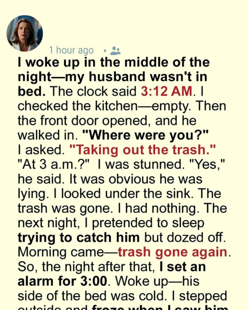 I stepped quietly onto the porch, my heart pounding so loud I was sure he’d hear it. The street was empty, lit only by a flickering lamp—except for my husband standing by the curb, holding our trash bag.