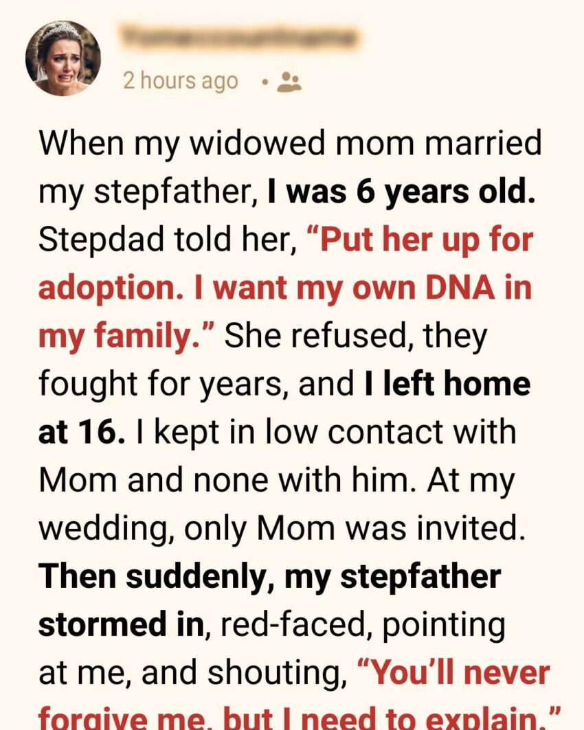 When my widowed mom married my stepfather, I was six years old—old enough to understand tension, but too young to understand its cause. What I did understand was the moment he looked at me with cold, assessing eyes and told my mother, “Put her up for adoption. I want my own DNA in my family.”