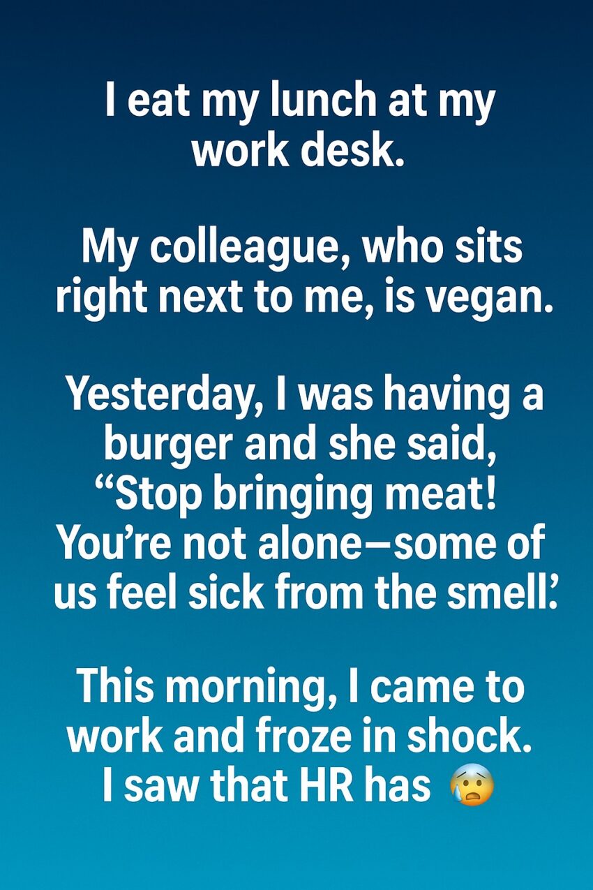 “I eat my lunch at my work desk. My colleague, who sits right next to me, is vegan. Yesterday, I was having a burger and she said, ‘Stop bringing meat! You’re not alone—some of us feel sick from the smell.’ This morning, I came to work and froze in shock. I saw that HR has…”…sent out a company-wide email titled “Lunch Etiquette & Shared Workspace Considerations.” My heart dropped as I clicked it open, expecting to see my name or some direct complaint aimed at me. Instead, the message was surprisingly neutral. It reminded employees to be mindful of strong-smelling foods, to use designated eating areas when possible, and to communicate respectfully with colleagues about shared spaces. No accusations. No disciplinary tone. Just a reminder to be considerate. Still, I felt uneasy. The timing was too close to yesterday’s conversation, and I couldn’t shake the feeling that my colleague had spoken to HR without telling me.