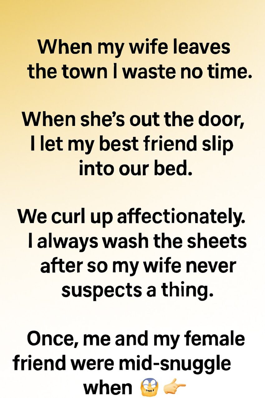 When my wife leaves town, I waste no time—but not in the way people might assume. As soon as the door closes and her car disappears down the street, the house grows unusually quiet. The ticking clock sounds louder, the sofa feels bigger, and the bed suddenly seems far too empty. That’s when I call my best friend to come over. She doesn’t knock; she never needs to. She pads softly into the bedroom, hops onto the bed, and settles in beside me. We curl up comfortably, sharing warmth and silence, and for a moment, the loneliness fades. It’s nothing dramatic—just companionship in its simplest form.