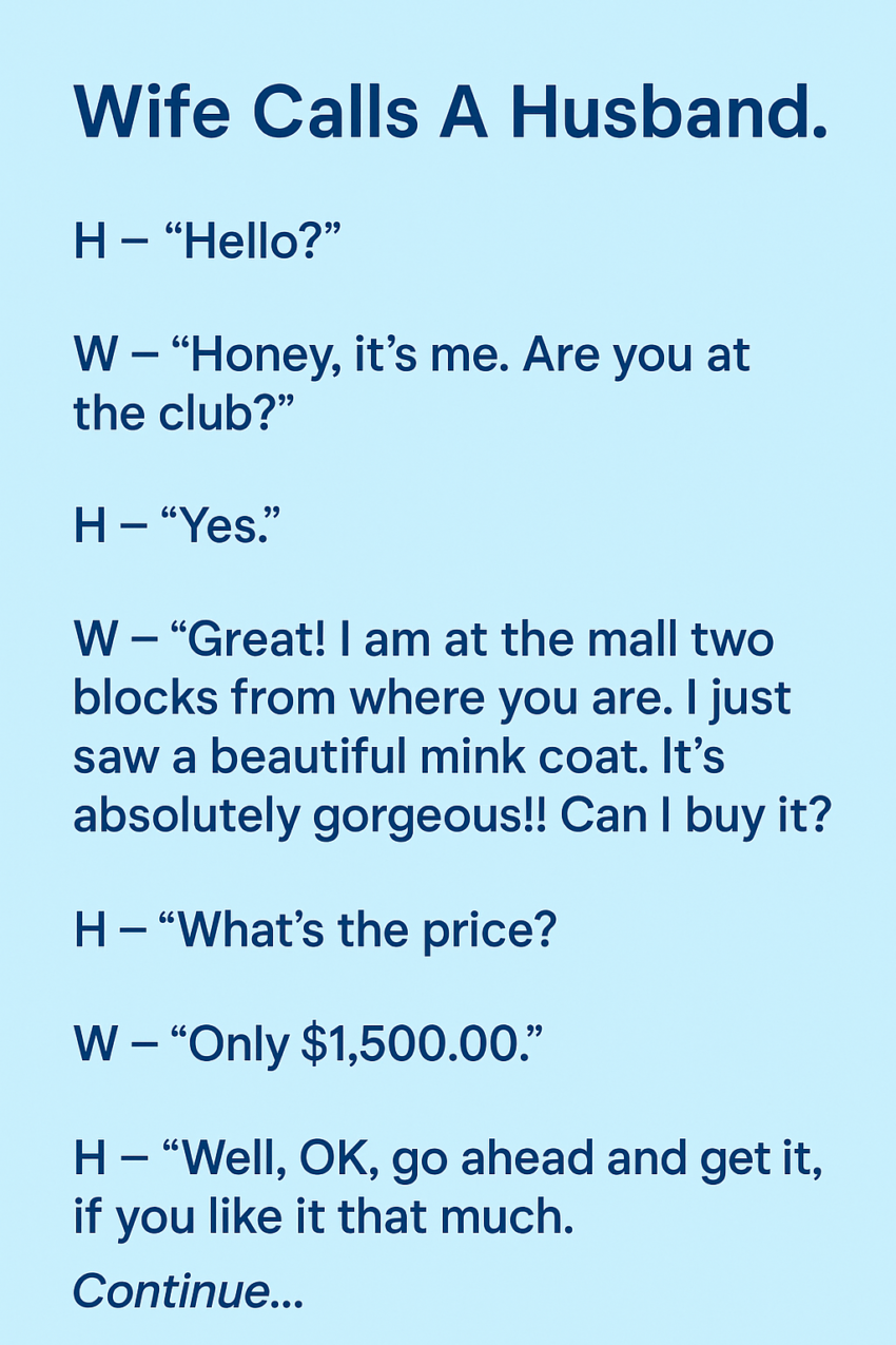 W – “Great! I’m at the mall two blocks from you. I just saw a beautiful mink coat. It’s absolutely gorgeous! Can I buy it?”