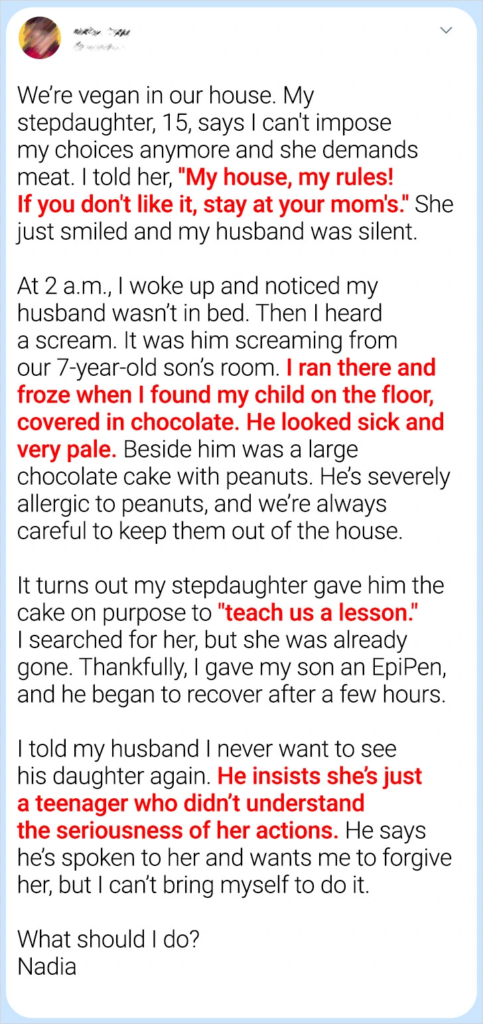 Blended families often encounter unique challenges, where minor disagreements can quickly grow into significant conflicts. For Nadia, a request to uphold her vegan lifestyle within her home sparked an unexpected and intense reaction. Her stepdaughter’s startling response left her feeling distressed, furious, and eager for advice. Seeking clarity, she turned to us for support in navigating this delicate situation.