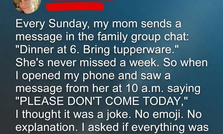The text message broke our usual Sunday routine with just five blunt words. No explanation, no warmth—just a sudden wall between us. We drove over in silence, bracing for disaster. The porch light glowed, the house felt unnaturally still, and when we stepped into the kitchen, we saw a stranger sitting where Dad once sat.