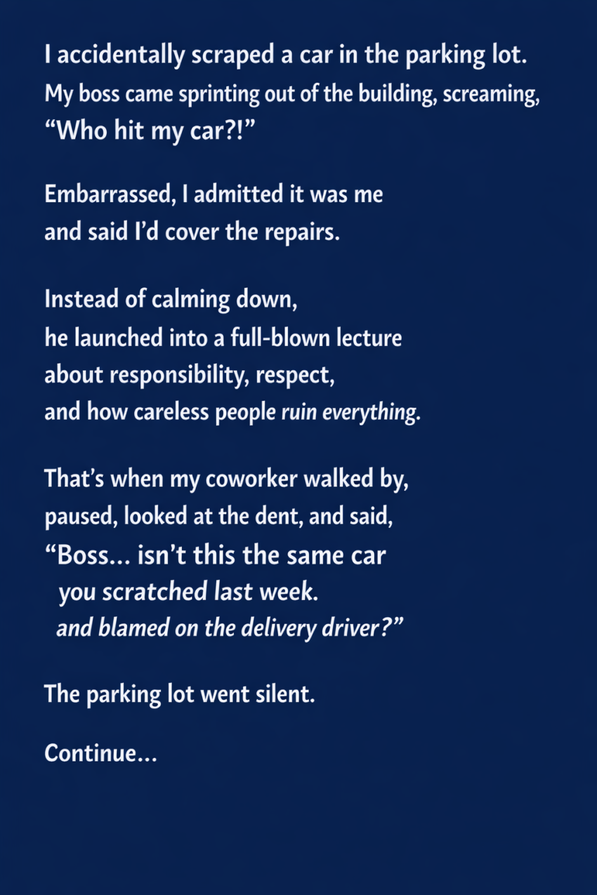 accidentally scraped a car in the parking lot while trying to squeeze into a tight space. The lot was cramped, I misjudged the angle, and there it was—a sharp, unmistakable scrape. My stomach dropped. Before I could even step out of my car to assess the damage or leave a note, the building’s side door flew open.