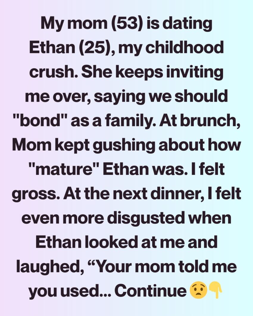 The moment Ethan saw me, he laughed and said, “Your mom told me you used to have a crush on me. Cute, right?” Then he winked.