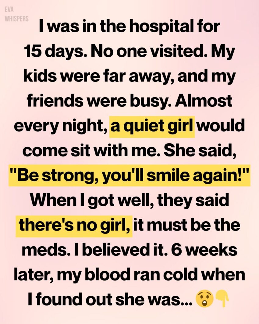 She was quiet, maybe thirteen or fourteen, with dark hair she tucked behind her ears and eyes that seemed older than her face. She never said much. She would pull a chair close to my bed and sit there, hands folded in her lap, as if she belonged. I couldn’t speak, couldn’t ask who she was or why she came, but somehow she understood. She’d lean in and whisper softly, careful not to disturb the room.