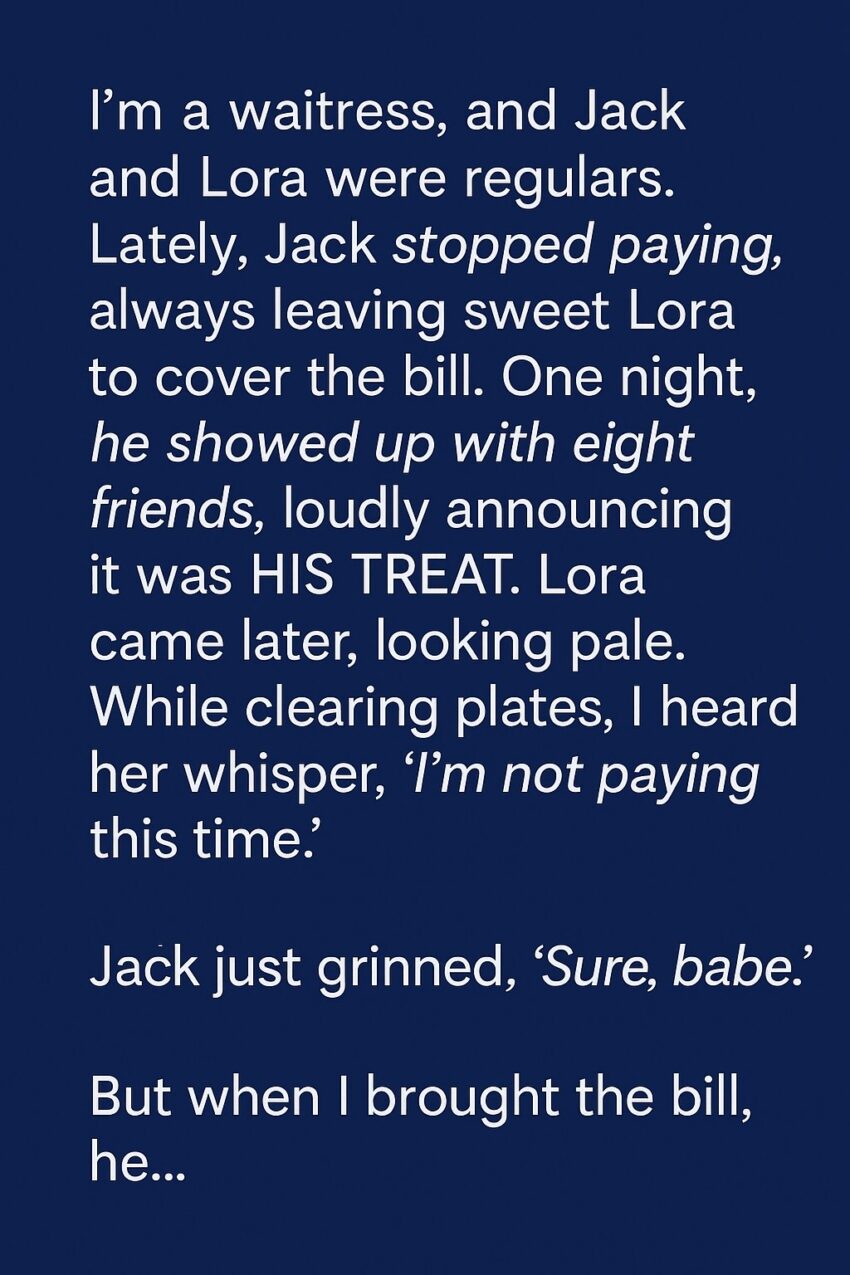 Jack strutted into the upscale restaurant with eight buddies in tow, loud and overconfident, boasting that tonight was on him. He slapped menus shut, ordered the most expensive appetizers, and bragged loudly about “treating his people right.” But when the $827.64 bill arrived, he casually slid it across the table to his girlfriend, Lora, like he always did.