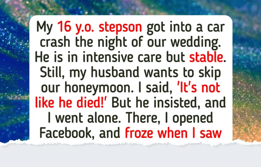 My 16 y.o. stepson got into a car crash the night of our wedding. He is in intensive care but stable. Still, my husband wants to skip our honeymoon. I said, ’’It’s not like he died!’’ But he insisted, and I went alone.