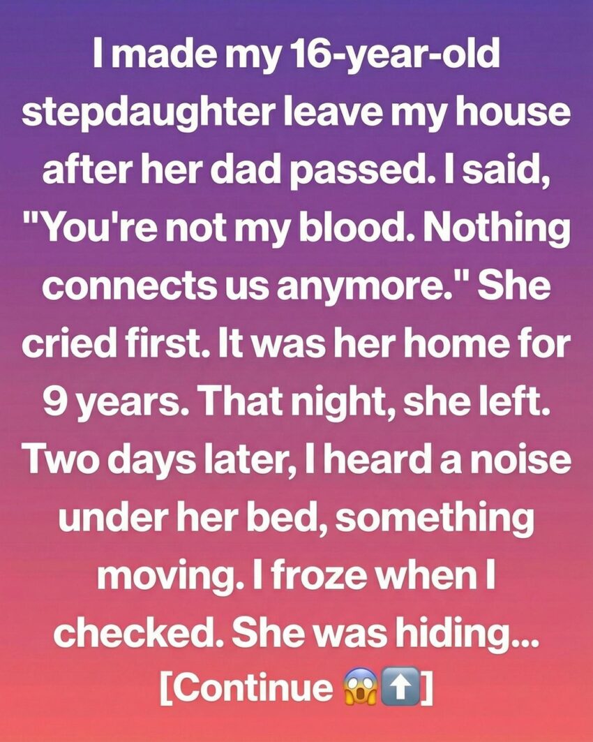 The next two days passed slowly. I avoided her room, convincing myself it was better not to look inside. But on the third night, as I walked down the hallway, I heard a faint sound coming from beneath her bed—a soft rustle, like fabric shifting. My heart jumped. I froze, unsure what I was afraid of, then knelt down to look. What I found wasn’t what I expected. Hidden neatly under the bed were several small boxes, folded clothes, and a notebook. They weren’t forgotten items. They were carefully arranged, as if she planned to come back for them someday. Among them was a photo of her and her father, taped to the notebook’s cover. The realization hit me all at once: she hadn’t left because she stopped caring. She left because I told her she didn’t belong.
