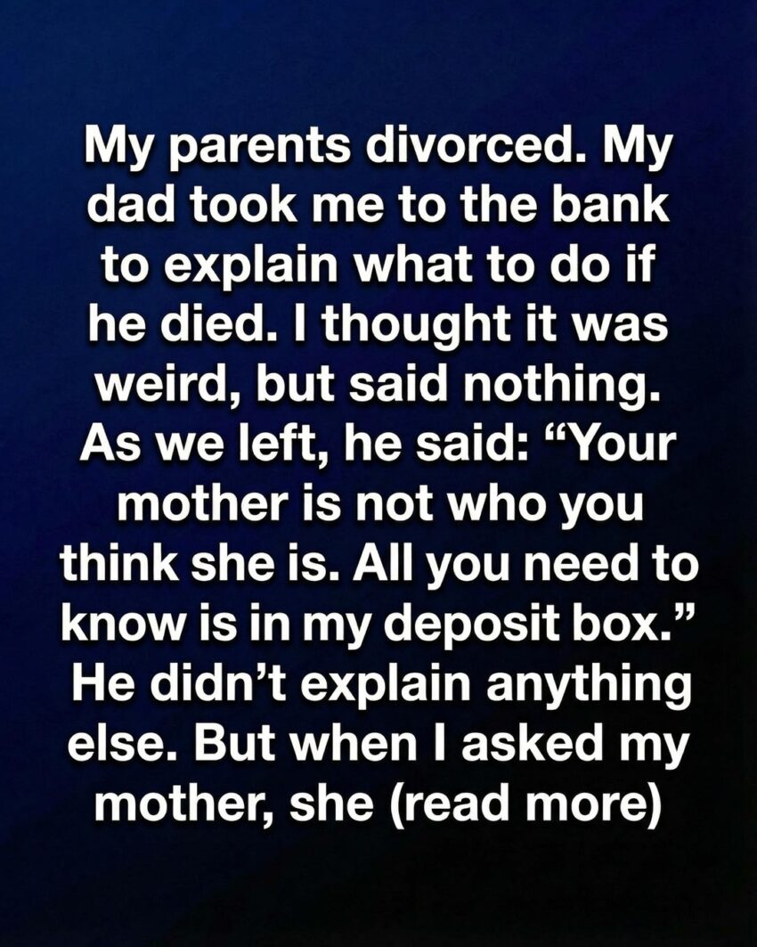 I was twelve when my parents divorced, old enough to sense tension but too young to understand the quiet decisions adults make when they’re trying to protect something fragile. A few weeks after the paperwork was finalized, my dad took me to the bank. He explained practical things—where documents were kept, who to contact, what steps to follow if anything ever happened to him. It felt strange, almost uncomfortable, listening to a conversation that seemed meant for a much older version of me. As we left, he paused, rested his hand on my shoulder, and said something I didn’t fully grasp at the time: “Your mother is not who you think she is. Everything you need to know is in my deposit box.” He didn’t explain further, and I didn’t ask. Some sentences linger because they’re unfinished.