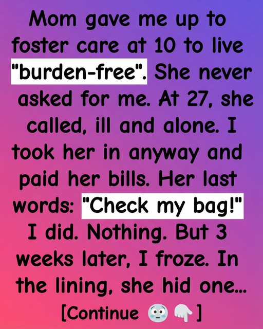Three weeks later, while sorting through old documents she had stored in a drawer, I found a small envelope hidden inside the lining of that same bag. Inside was a letter written years ago, never sent. In it, she wrote about fear, regret, and choices she didn’t know how to undo. She admitted she believed letting me go would give me a better life, even though she never found the courage to check if that was true. The letter didn’t erase the past, but it softened it. I realized that healing doesn’t always come from answers—it comes from understanding that people are often shaped by their own limitations. I folded the letter carefully and put it away, not as an excuse, but as a reminder that I survived, grew, and learned to move forward with compassion instead of carrying the weight forever.