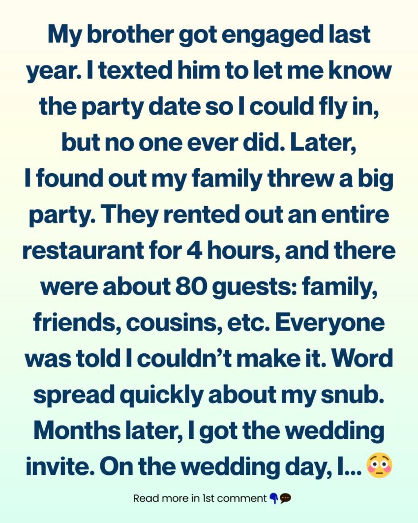 After a few weeks passed, I texted my brother again to ask about the date, pointing out that it must be coming up soon and that I didn’t want to pay for a last-minute flight. He didn’t respond. I then asked my mom for details, and she told me, “It’s not really an engagement party, just a small dinner with family. There’s no need to come down for it.”