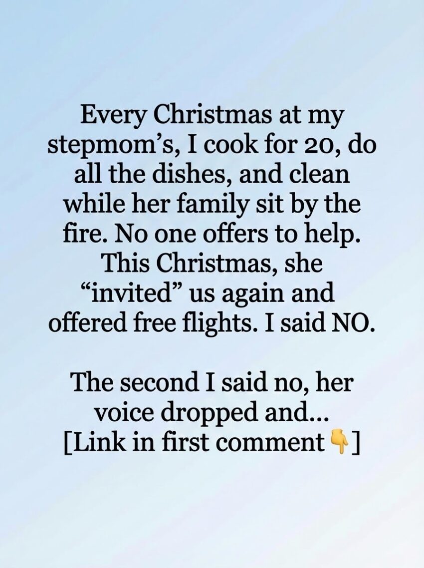 For years, Christmas at my stepmother’s house followed the same unspoken script. The invitations always sounded warm and generous, filled with talk of family, tradition, and togetherness. But once we arrived, the reality was very different. While her relatives settled into armchairs by the fireplace, laughing and exchanging stories, I found myself in the kitchen from morning until night. I cooked meals for nearly twenty people, kept track of dietary requests, washed endless stacks of dishes, and cleaned as I went. No one ever asked if I needed help. No one noticed how tired I was. I told myself it was just one day a year and that keeping the peace mattered more than speaking up.
