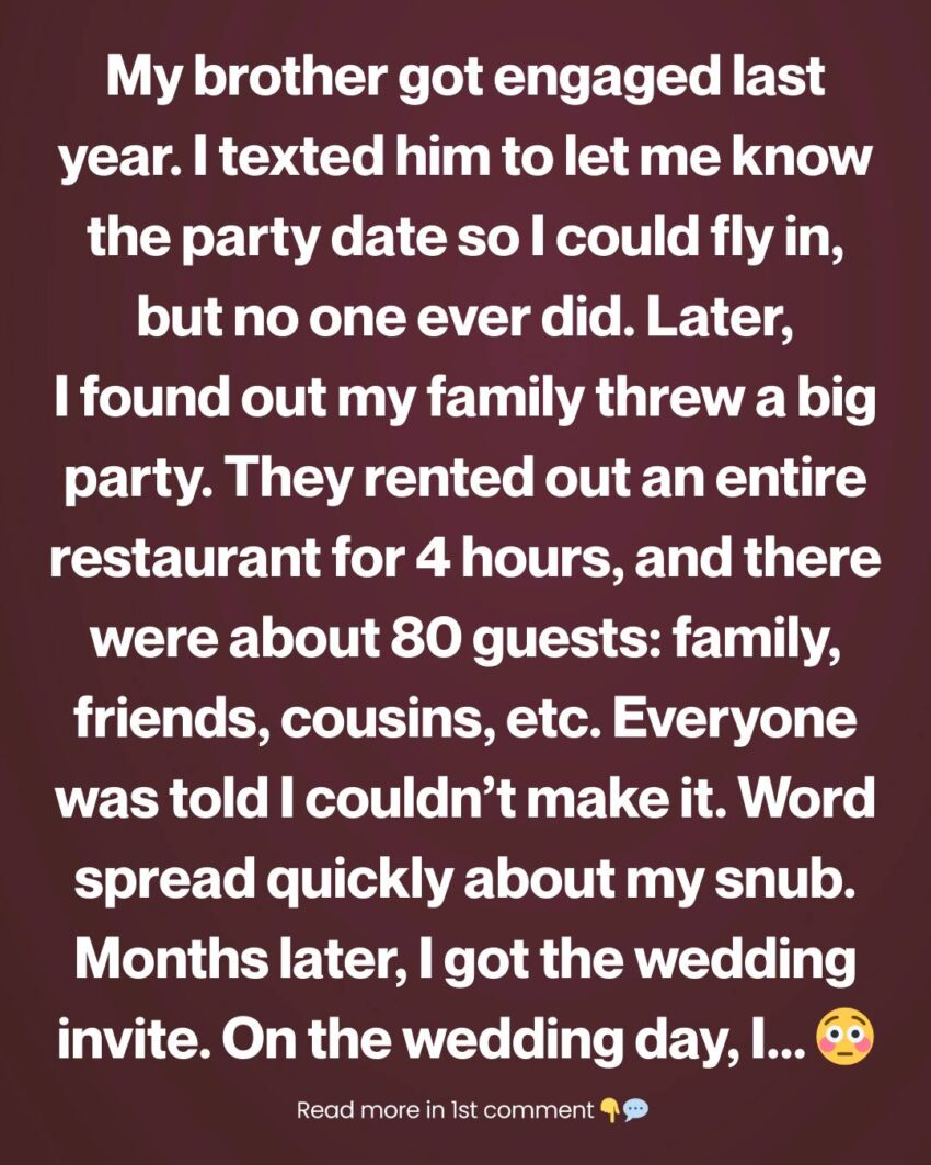 After a few weeks passed, I texted my brother again to ask about the date, pointing out that it must be coming up soon and that I didn’t want to pay for a last-minute flight. He didn’t respond. I then asked my mom for details, and she told me, “It’s not really an engagement party, just a small dinner with family. There’s no need to come down for it.”