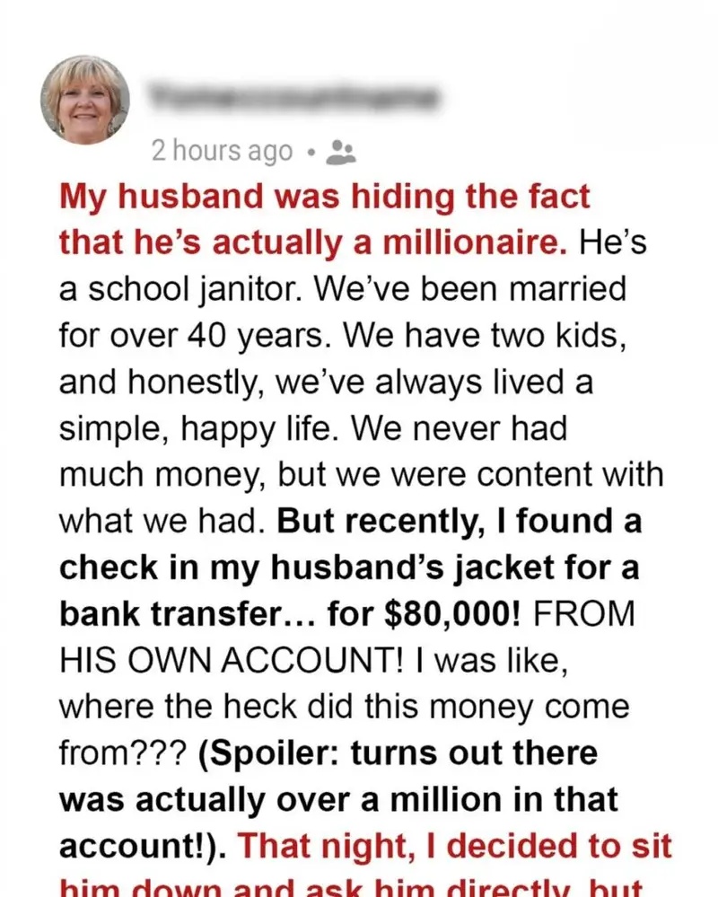 After forty-three years of marriage, I thought I knew everything about my husband, Tom. We built a simple life together — he worked as a school janitor, and I sold clothes at the department store. Our home wasn’t grand, but it was filled with laughter, memories, and the quiet pride that comes from honest work. So when I found a bank receipt showing an $80,000 transfer from Tom’s account to a charity I’d never heard of, my heart nearly stopped.