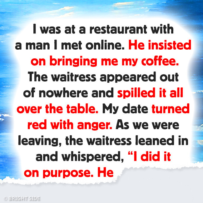 - I was at a restaurant with a man I met online. He insisted on bringing me my coffee, but the waitress appeared out of nowhere and spilled it all over the table. My date turned red with anger.