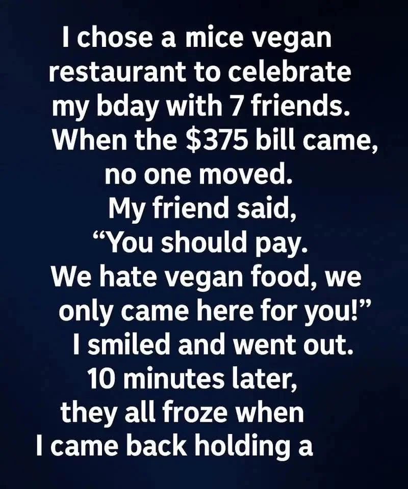I had been eagerly anticipating my birthday dinner for weeks just a small, heartfelt gathering with the people who mattered most to me. I chose a cozy vegan restaurant, softly lit and filled with gentle music, the kind of place that invited laughter and connection. As the night began, everything felt perfect warm conversation, shared memories, and the easy comfort of being surrounded by friends.