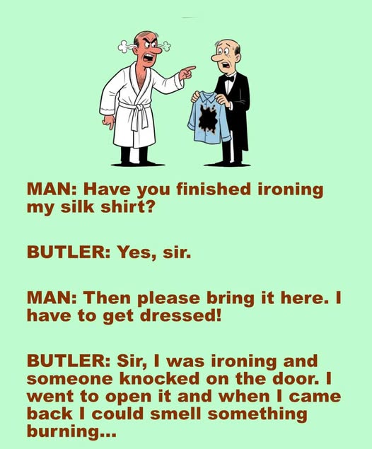BUTLER: Sir, I was ironing and someone knocked on the door. I went to open it and when I came back I could smell something burning…