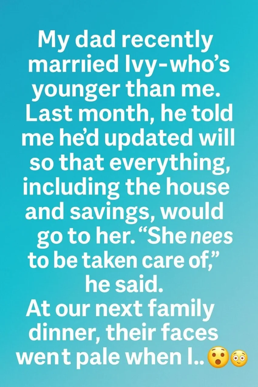 My dad recently married Ivy who’s younger than me. Last month, he told me he’d updated his will so that everything, including the house and savings, would go to her. “She needs to be taken care of,” he said.