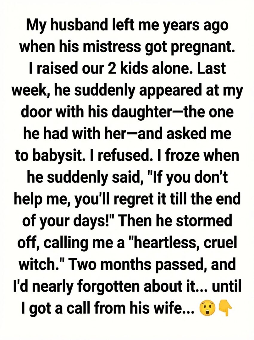 Years ago, my marriage ended in a way I never imagined. My husband left suddenly, and I was left to raise our two children on my own. There were no dramatic goodbyes or long explanations—just a quiet absence that forced me to grow stronger than I thought possible. Life became a careful balance of work, parenting, and emotional healing. Over time, I rebuilt stability for my children and myself, learning how to stand on my own without resentment guiding my decisions. The past remained painful, but it no longer controlled me.