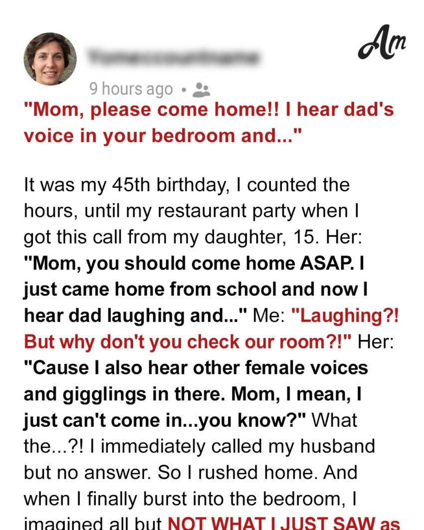 “Mom, you should come home,” she said without even saying hello. “I just got back from school, and I hear Dad laughing in your room… with other voices.”