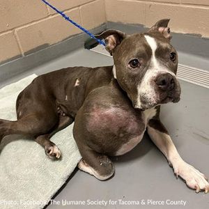 Libby, a 5-year-old pit bull, arrived at The Humane Society for Tacoma & Pierce County with the largest mass they have ever seen on her front leg. The staff immediately fell in love with her sweet demeanor and were determined to help her.