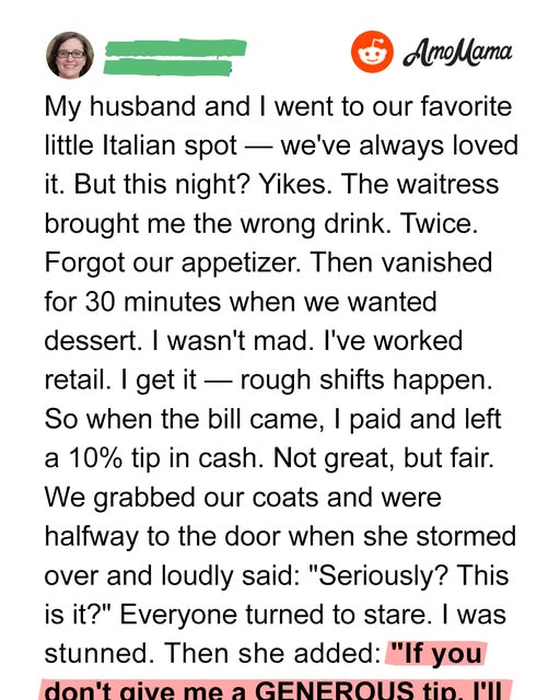We turned to leave again. I just wanted to get out of there with whatever dignity we had left. But then she muttered something that pushed me over the edge.She said it just loud enough for the whole restaurant to hear. And that’s when something inside me snapped.