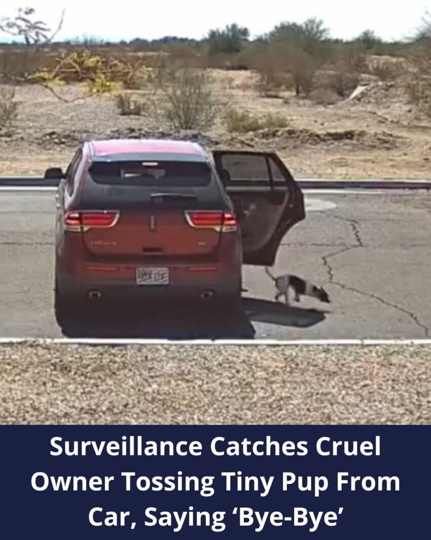 At the beginning of the video, we can see a red SUV driving along a dead-end street. As the driver makes a U-turn, a woman opens the back door and throws a black-and-white pup on the street.