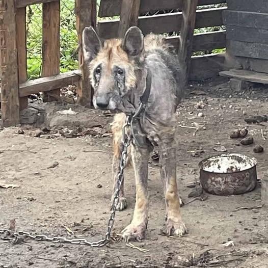 Days passed, and Kira’s condition worsened. Her ribs jutted through her thinning fur, her once-bright eyes clouded with exhaustion.She had developed severe skin infections from the unsanitary conditions, and dehydration left her barely able to stand.