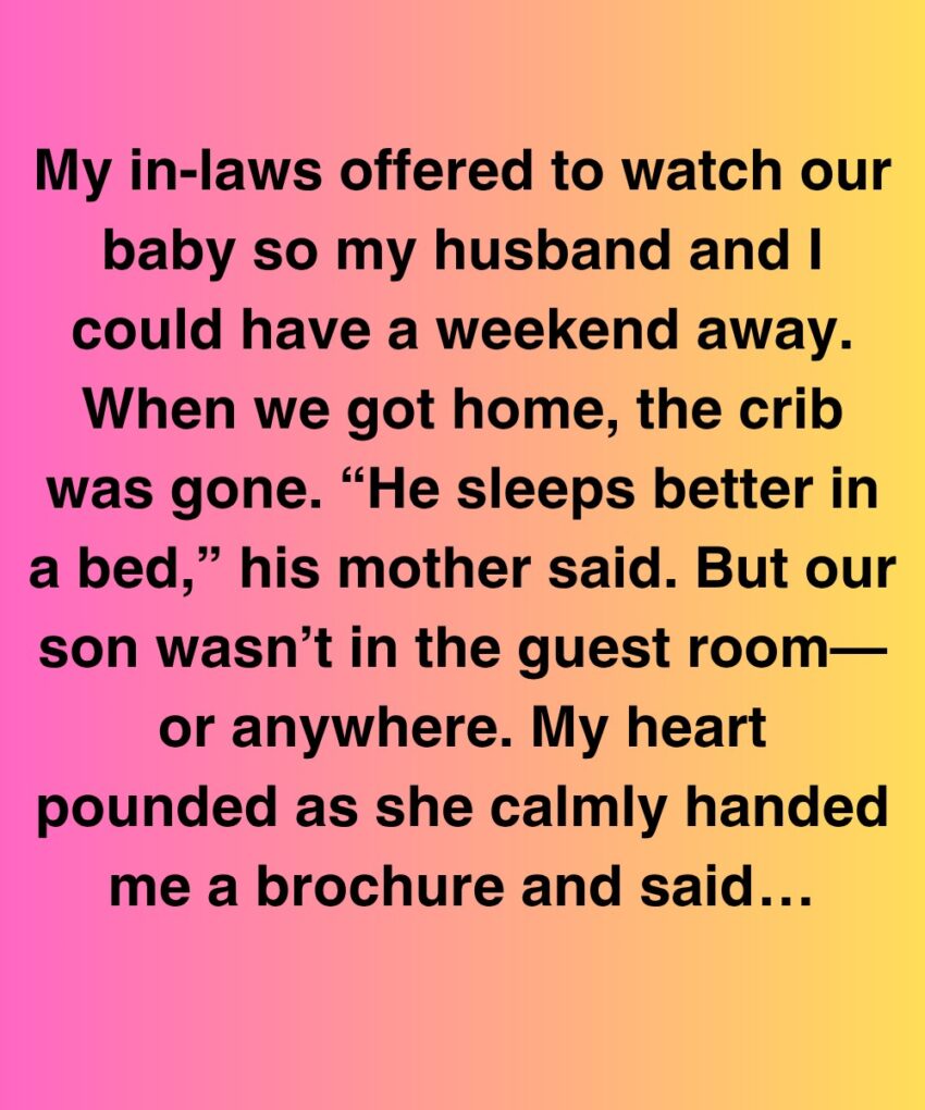 My in-laws offered to watch our baby so my husband and I could have a weekend away. When we got home, the crib was gone. “He sleeps better in a bed,” his mother said. But our son wasn’t in the guest room—or anywhere. My heart pounded as she calmly handed me a brochure and said, “Don’t worry, he’s in very capable hands now.”