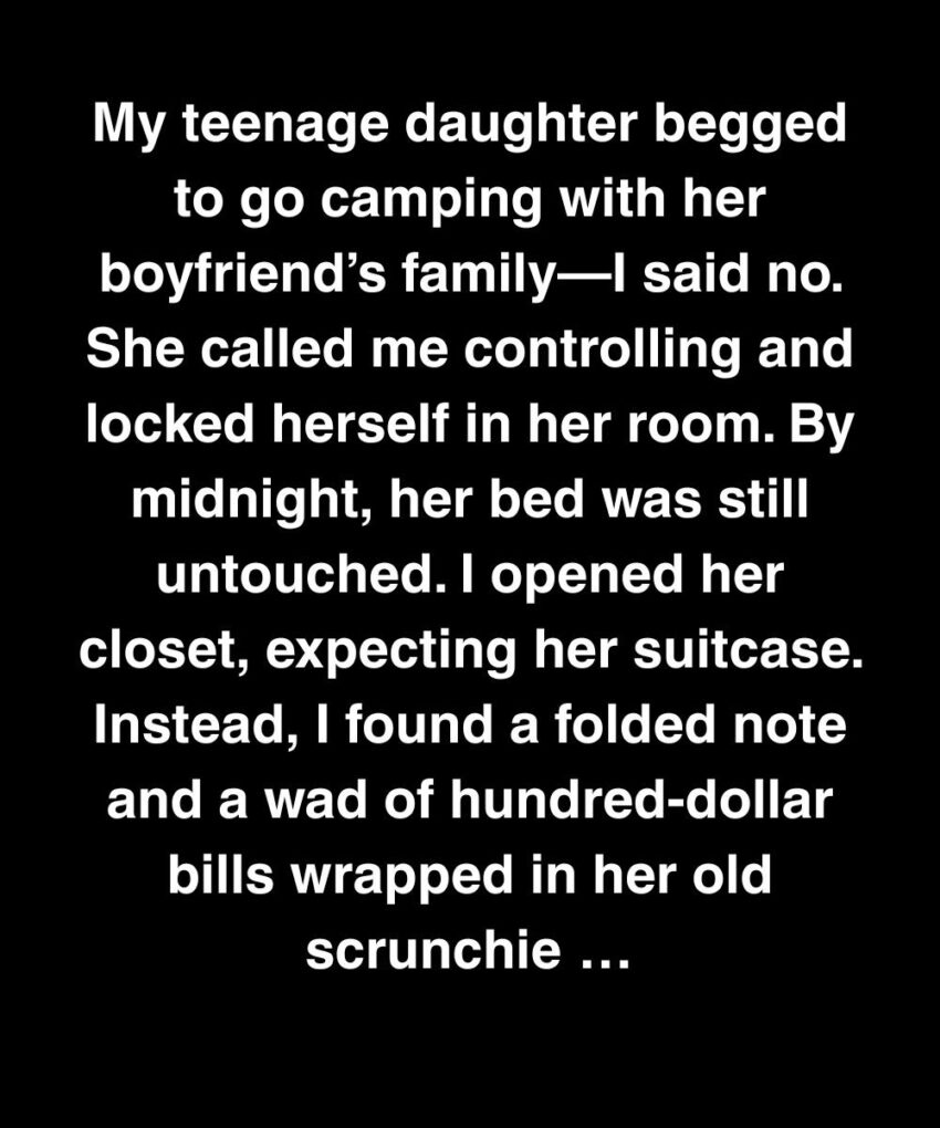 My teenage daughter begged to go camping with her boyfriend’s family—I said no. She called me controlling and locked herself in her room. By midnight, her bed was still untouched. I opened her closet, expecting her suitcase. Instead, I found a folded note and a wad of hundred-dollar bills wrapped in her old scrunchie…