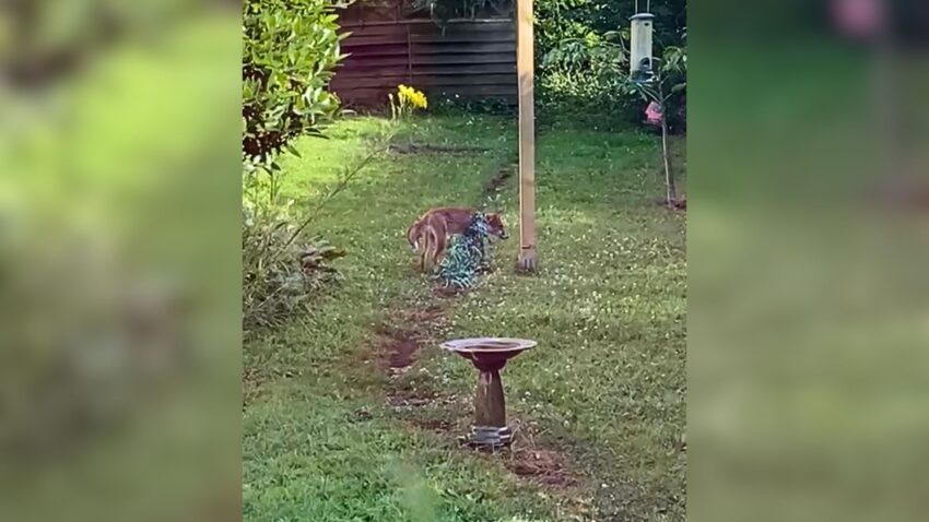 He had just spotted something strange on their home security camera and quickly alerted the rest of the family to the unusual sight in their backyard.Among the flowers and garden decorations, there was a young fox with a strange green material hanging around its neck and body.