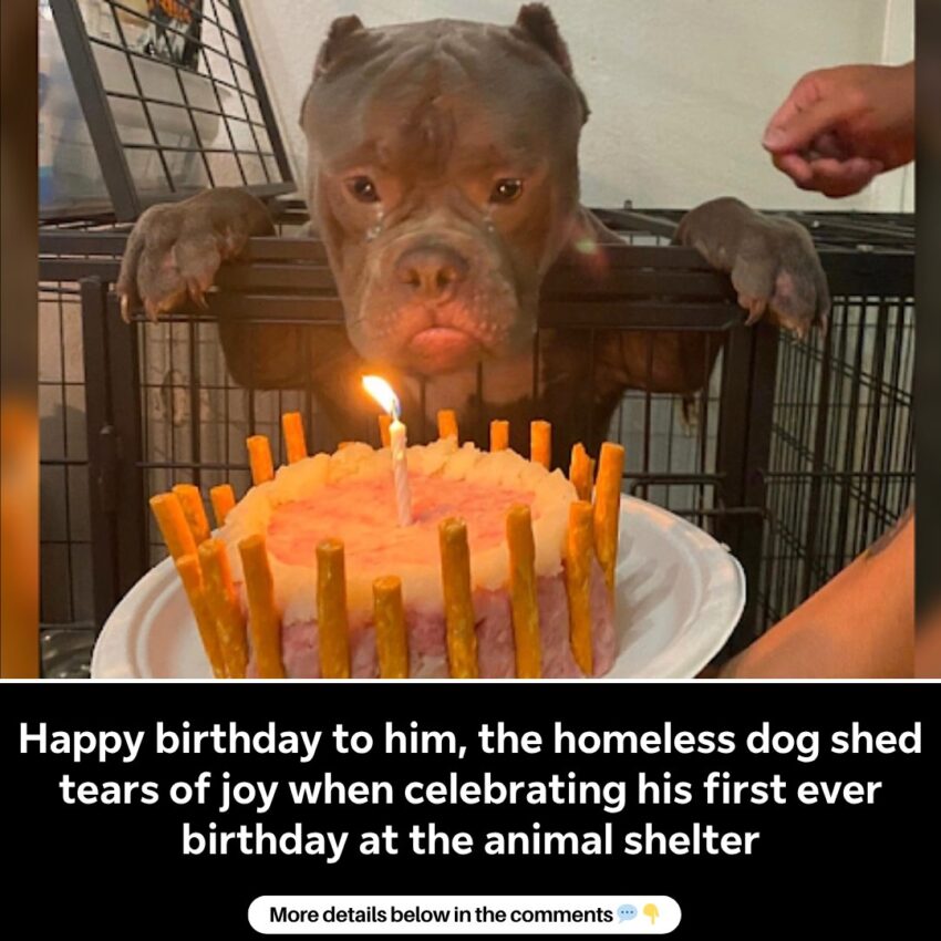 Happy birthday to him, the homeless dog shed tears of joy when celebrating his first ever birthday at the animal shelter
