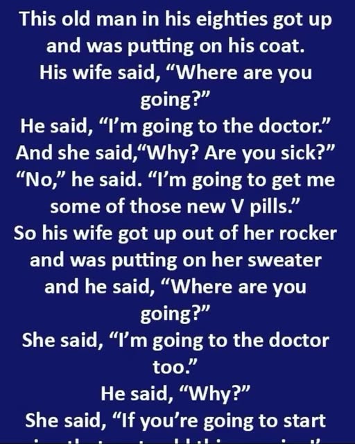 And she said,“Why? Are you sick?” “No,” he said. “I’m going to get me some of those new Via4ra pills.” So his wife got up out of her rocker and was putting on her sweater and he said, “Where are you going?”She said, “I’m going to the doctor too.” He said, “Why?”