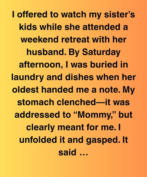I offered to watch my sister’s kids while she attended a weekend retreat with her husband. By Saturday afternoon, I was buried in laundry and dishes when her oldest handed me a note. My stomach clenched—it was addressed to “Mommy,” but clearly meant for me. I unfolded it and gasped. It said: