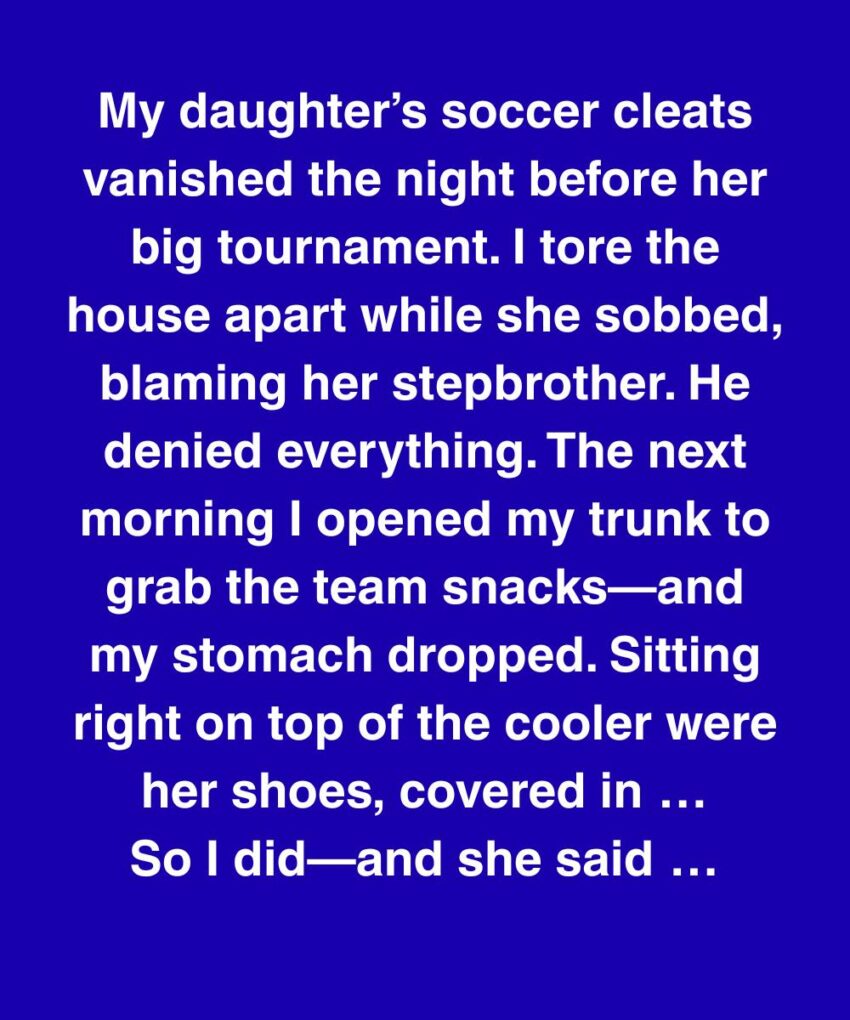 My daughter’s soccer cleats vanished the night before her big tournament. I tore the house apart while she sobbed, blaming her stepbrother. He denied everything. The next morning I opened my trunk to grab the team snacks—and my stomach dropped. Sitting right on top of the cooler were her shoes, covered in sticky orange Gatorade and crushed granola.