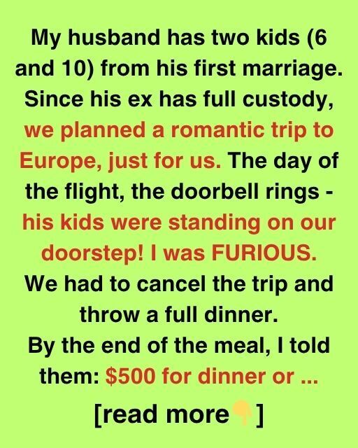 My husband has two kids (6 and 10) from his first marriage. Since his ex has full custody, we planned a romantic trip to Europe, just for us. The day of the flight, the doorbell rings — his kids were standing on our doorstep! I was FURIOUS. We had to cancel the trip and throw a full dinner. By the end of the meal, I told them: $500 for dinner or…