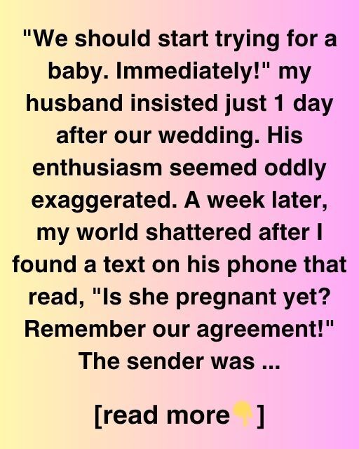 “We should start trying for a baby. Immediately!” my husband insisted just one day after our wedding. His enthusiasm seemed oddly exaggerated. A week later, my world shattered after I found a text on his phone that read, “Is she pregnant yet? Remember our agreement!” The sender was a name I didn’t recognize—Lena.