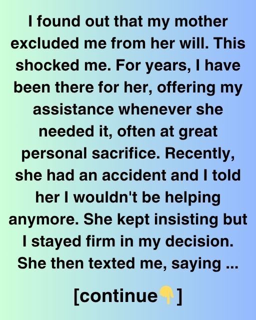 I found out that my mother excluded me from her will. This shocked me. For years, I have been there for her, offering my assistance whenever she needed it, often at great personal sacrifice. Recently, she had an accident and I told her I wouldn’t be helping anymore. She kept insisting but I stayed firm in my decision. She then texted me, saying, “I see now what your true colors are. You’ve made your choice. Don’t expect anything from me when I’m gone.”