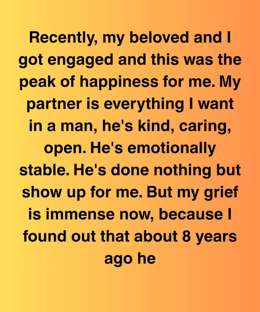 Recently, my beloved and I got engaged and this was the peak of happiness for me. My partner is everything I want in a man, he’s kind, caring, open. He’s emotionally stable. He’s done nothing but show up for me. But my grief is immense now, because I found out that about 8 years ago he was involved in something that directly—and unknowingly—touched my life in the most painful way.