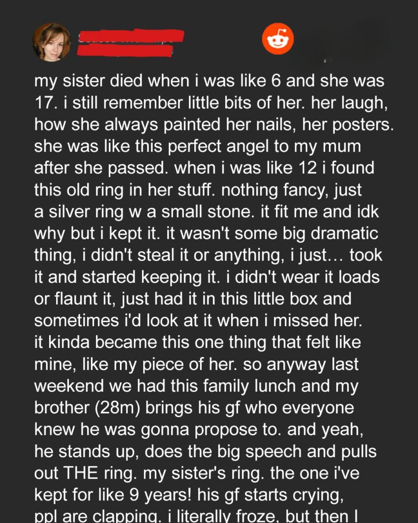 I eventually told Rose, Daniel’s fiancée, the truth. She listened, understood, and without hesitation, gave the ring back. “It never belonged to me,” she said. That moment meant more than anything my family had offered. To them, I was being dramatic. But to Rose, I was just a grieving sister trying to hold onto something real.