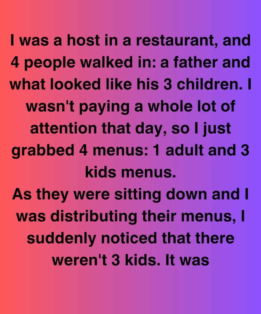 I was a host in a restaurant, and 4 people walked in: a father and what looked like his 3 children. I wasn’t paying a whole lot of attention that day, so I just grabbed 4 menus: 1 adult and 3 kids menus.