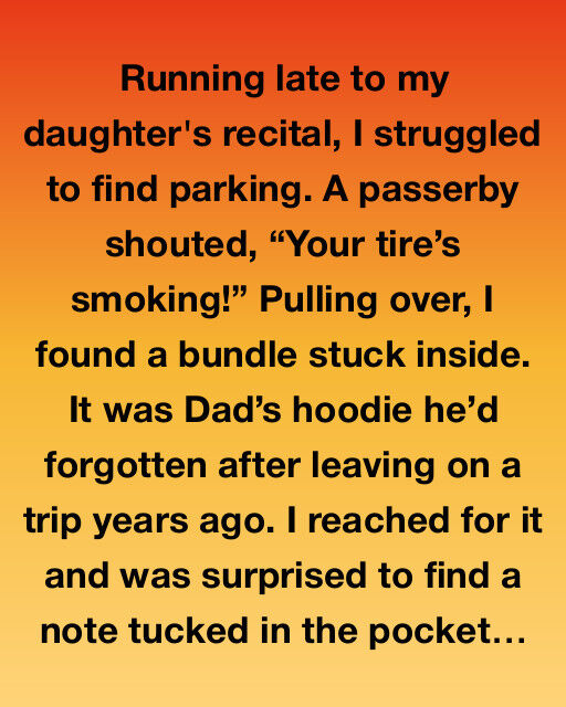 Running late to my daughter’s recital, I struggled to find parking. A passerby shouted, “Your tire’s smoking!” Pulling over, I found a bundle stuck inside. It was Dad’s hoodie he’d forgotten after leaving on a trip years ago. I reached for it and was surprised to find a note tucked in the pocket.