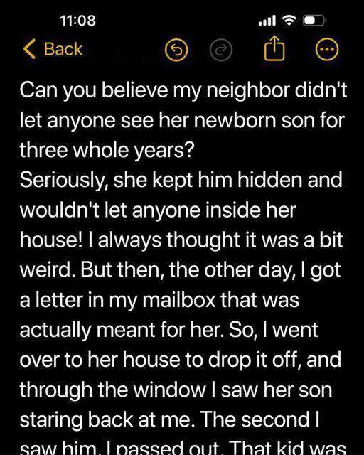 Seriously, she kept him hidden and wouldn’t let anyone inside her house! I always thought it was a bit weird. But then, the other day, I got a letter in my mailbox that was actually meant for her. So, I went over to her house to drop it off, and through the window I saw her son staring back at me. The second I saw him. I passed out. That kid was…