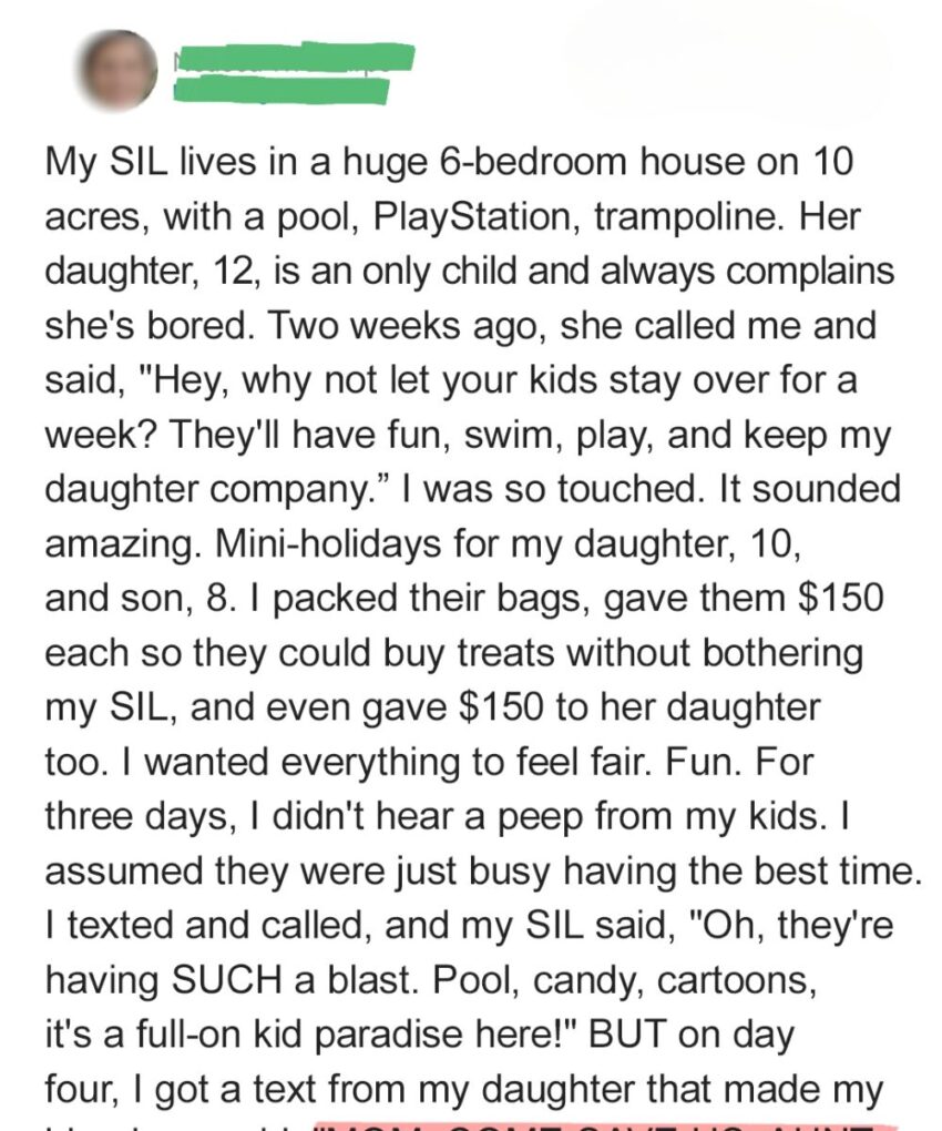 My SIL lives in a huge 6-bedroom house on 10 acres, with a pool, PlayStation, trampoline. Her daughter, 12, is an only child and always complains she’s bored. Two weeks ago, she called me and said, “Hey, why not let your kids stay over for a week? They’ll have fun, swim, play, and keep my daughter company.”