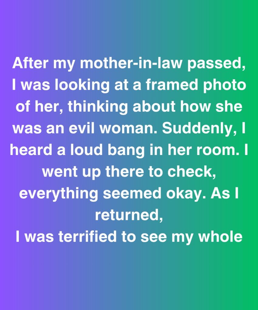After my mother-in-law passed, I was looking at a framed photo of her, thinking about how she was an evil woman. Suddenly, I heard a loud bang in her room. I went up there to check, everything seemed okay. As I returned, I was terrified to see my whole living room flipped over. Chairs knocked down, cushions on the floor, a vase shattered into tiny pieces. My hands went cold.