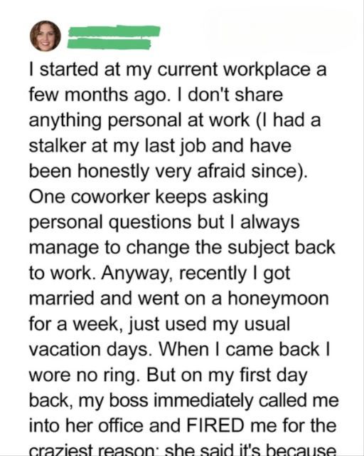 I started at my current workplace a few months ago. I don’t share anything personal at work (I had a stalker at my last job and have been honestly very afraid since). One coworker keeps asking personal questions but I always manage to change the subject back to work. Anyway, recently I got married and went on a honeymoon for a week, just used my usual vacation days. When I came back I wore no ring. But on my first day back, my boss immediately called me into her office and FIRED me for the craziest reason: she said it’s because I wasn’t wearing my wedding ring.