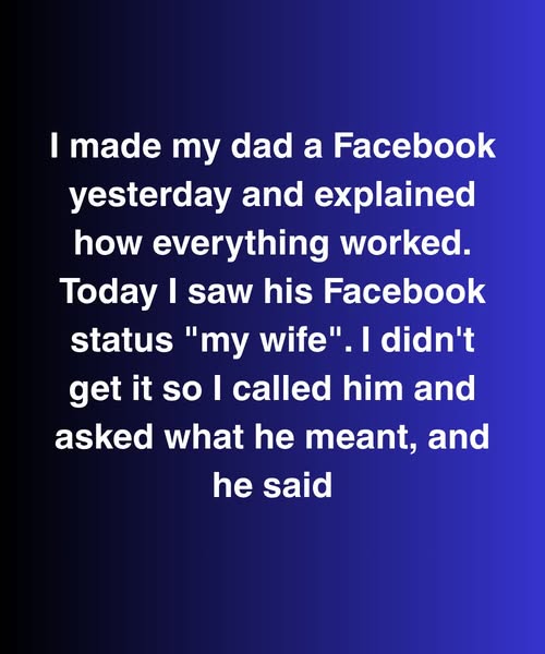 I made my dad a Facebook yesterday and explained how everything worked. Today I saw his Facebook status ‘my wife’. I didn’t get it so I called him and asked what he meant, and he said.
